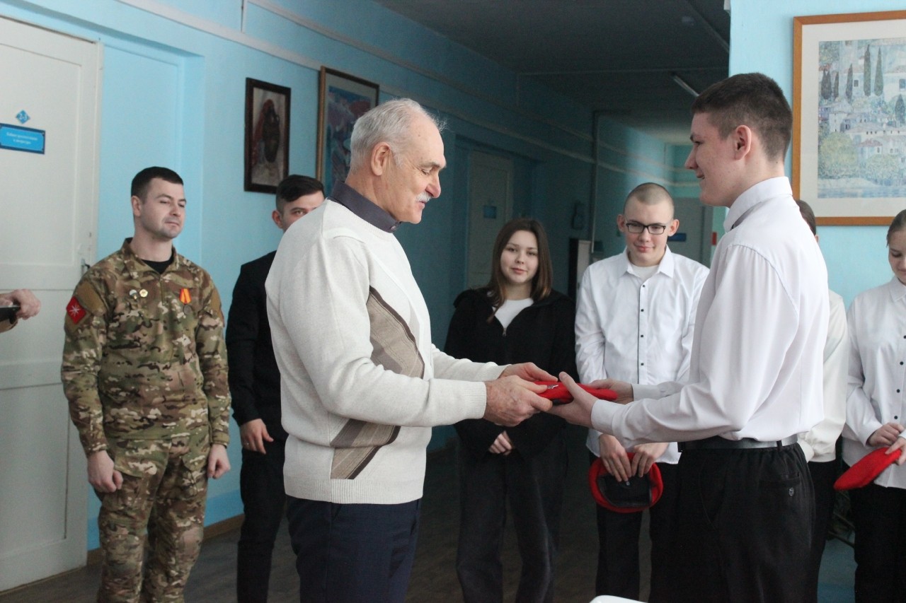 Новоиспечённым юнармейцам вручили значок «Юнармейца» и красный берет — символы принадлежности к движению.