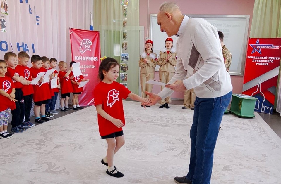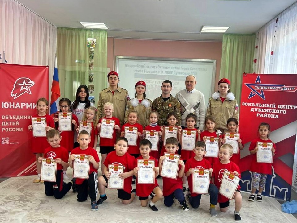 Сегодня в МКДОУ Детский сад №2 пос. Дубна прошло захватывающее и вдохновляющее мероприятие, приуроченное ко Дню Защитников Начальник штаба юнармии А.В. Молотков, Руководитель зонального центра муниципального образования Дубенский муниципальный округ и тренер-преподаватель по военно-спортивной подготовке М. А. Мошкин совместно с юнармейцами отряда "Витязь" имени Героя Советского союза И.В. Головина и волонтёрами отряда "Горячее сердце" Дубенской средней школы провели насыщенное занятие для детей из подготовительных групп "Непоседы", "Ромашка" и "Савята".